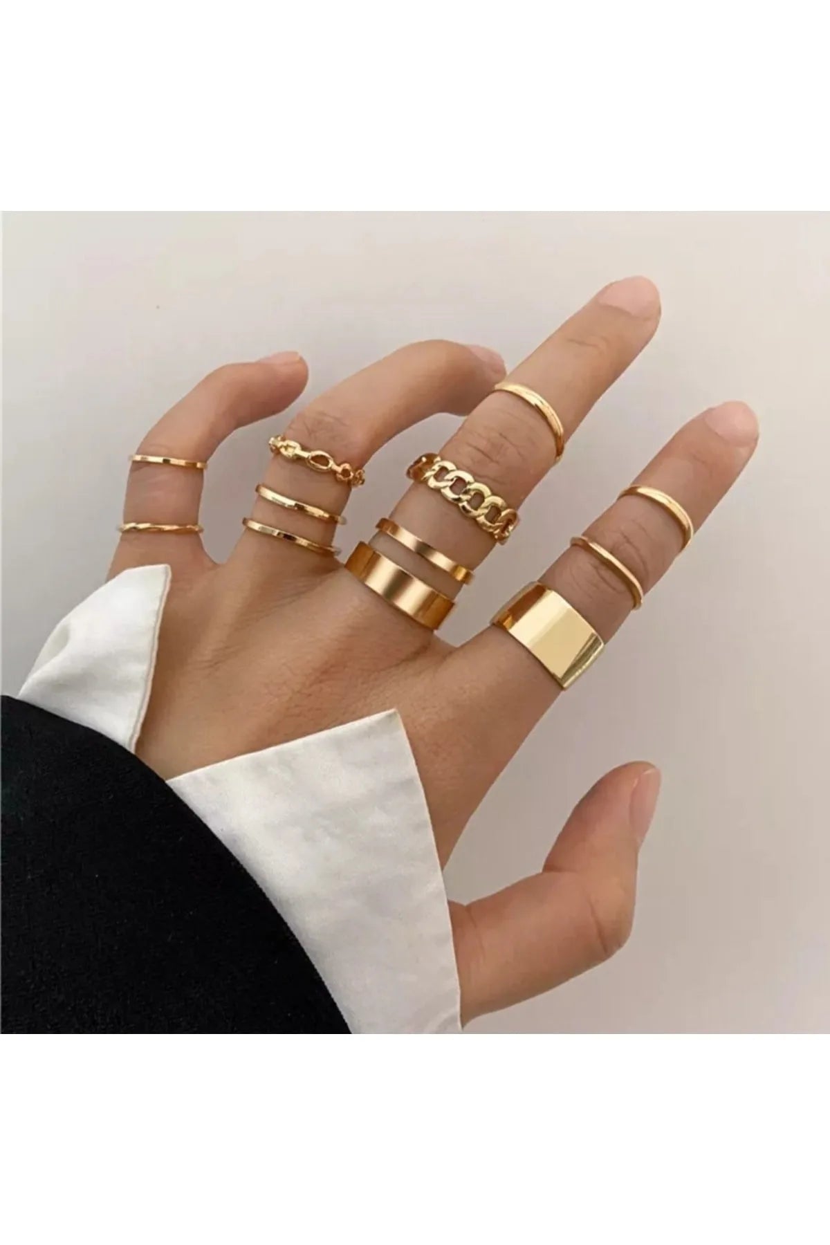 Kadın Gold 10’lu Kombin Yüzük Seti – Tarzına Işıltı Kat