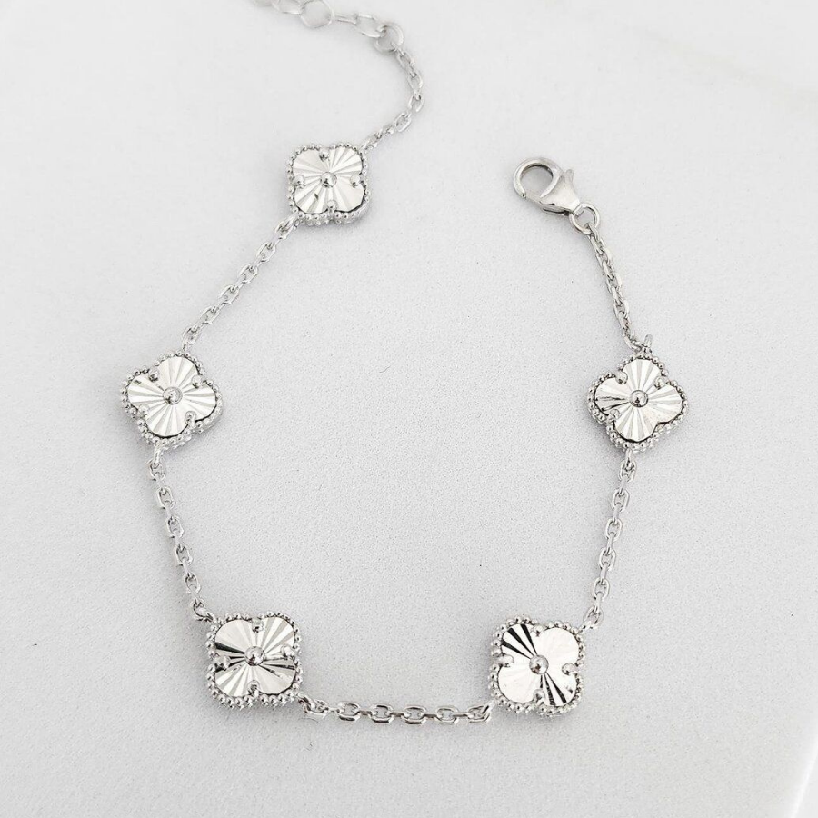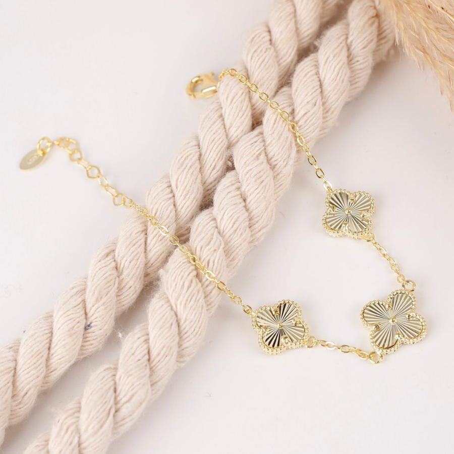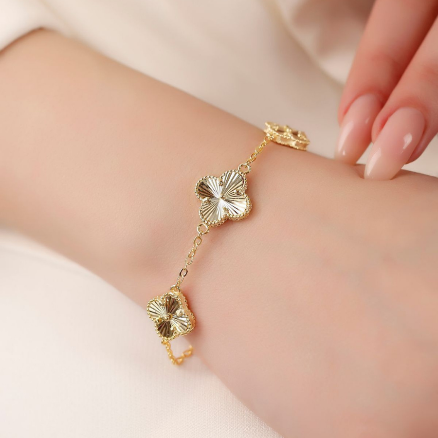 Zarafetiyle göz alan dört yapraklı yonca motifi, doğanın içten armağanı gibi bileğinizde hayat buluyor. Her yaprak, bir dileği fısıldarcasına ince işçilikle şekillendirilmiş; ışığı yumuşakça yansıtan taşlarla süslenmiştir.